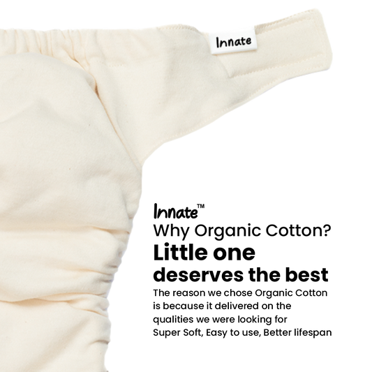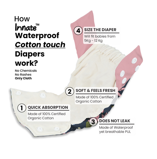 Innate Diapers offer a comfortable, leak-proof solution for your baby, crafted with high-quality materials like GOTS certified organic cotton and a waterproof bottom layer. Our diapers effectively absorb moisture, prevent leaks, and keep your baby's skin dry and irritation-free. With an adjustable fit and easy-to-use snapping/fastening system, diapering becomes a breeze, even in the absence of the mother. Experience reliable protection and peace of mind with Innate Diapers.